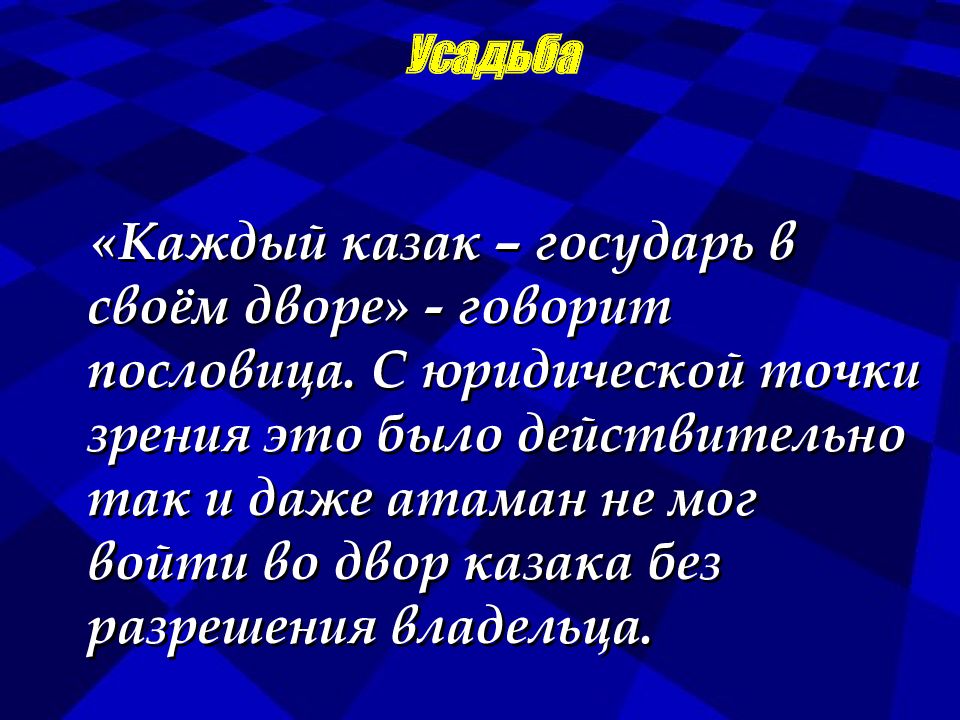 «Каждый казак – государь в своём дворе» - говорит пословица. С юридической точки зрения это было действительно так и даже атаман не мог войти во двор казака без разрешения владельца. Усадьба