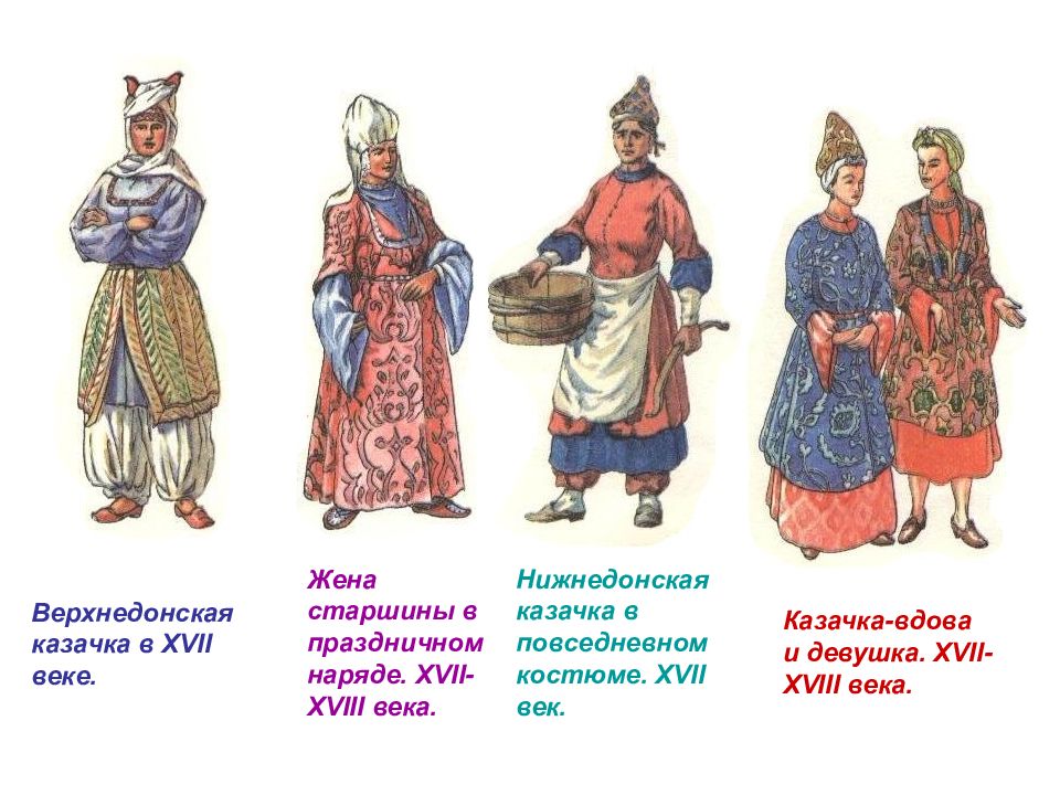 Верхнедонская казачка в XVII веке. Жена старшины в праздничном наряде. XVII - XVIII века. Нижнедонская казачка в повседневном костюме. XVII век. Казачка-вдова и девушка. XVII - XVIII века.