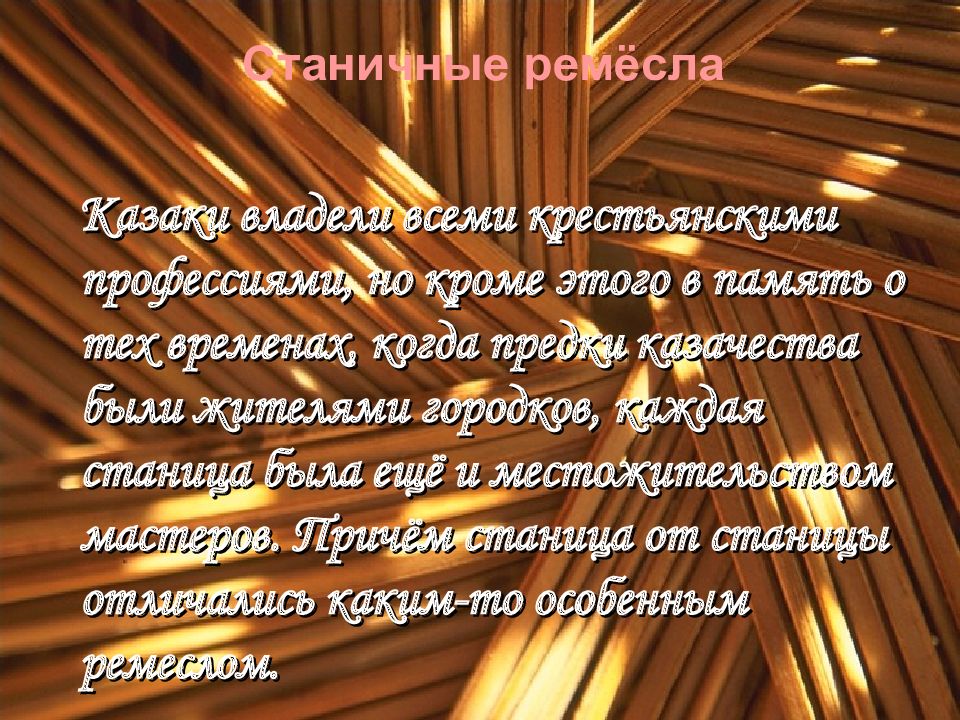 Казаки владели всеми крестьянскими профессиями, но кроме этого в память о тех временах, когда предки казачества были жителями городков, каждая станица была ещё и местожительством мастеров. Причём станица от станицы отличались каким-то особенным ремеслом. Станичные ремёсла