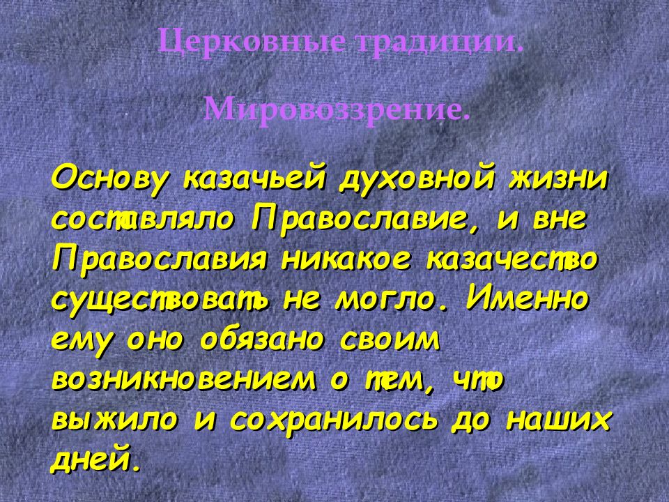 Основу казачьей духовной жизни составляло Православие, и вне Православия никакое казачество существовать не могло. Именно ему оно обязано своим возникновением о тем, что выжило и сохранилось до наших дней. Церковные традиции. Мировоззрение.
