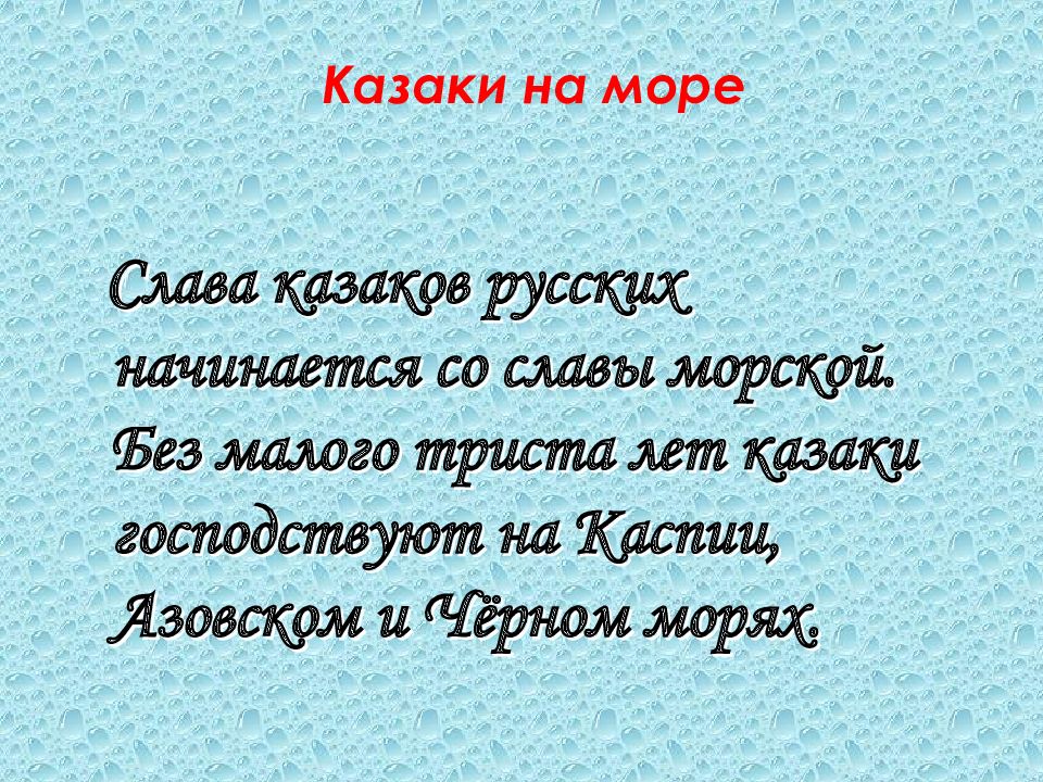 Слава казаков русских начинается со славы морской. Без малого триста лет казаки господствуют на Каспии, Азовском и Чёрном морях. Казаки на море