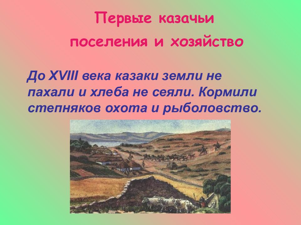 До XVIII века казаки земли не пахали и хлеба не сеяли. Кормили степняков охота и рыболовство. Первые казачьи поселения и хозяйство