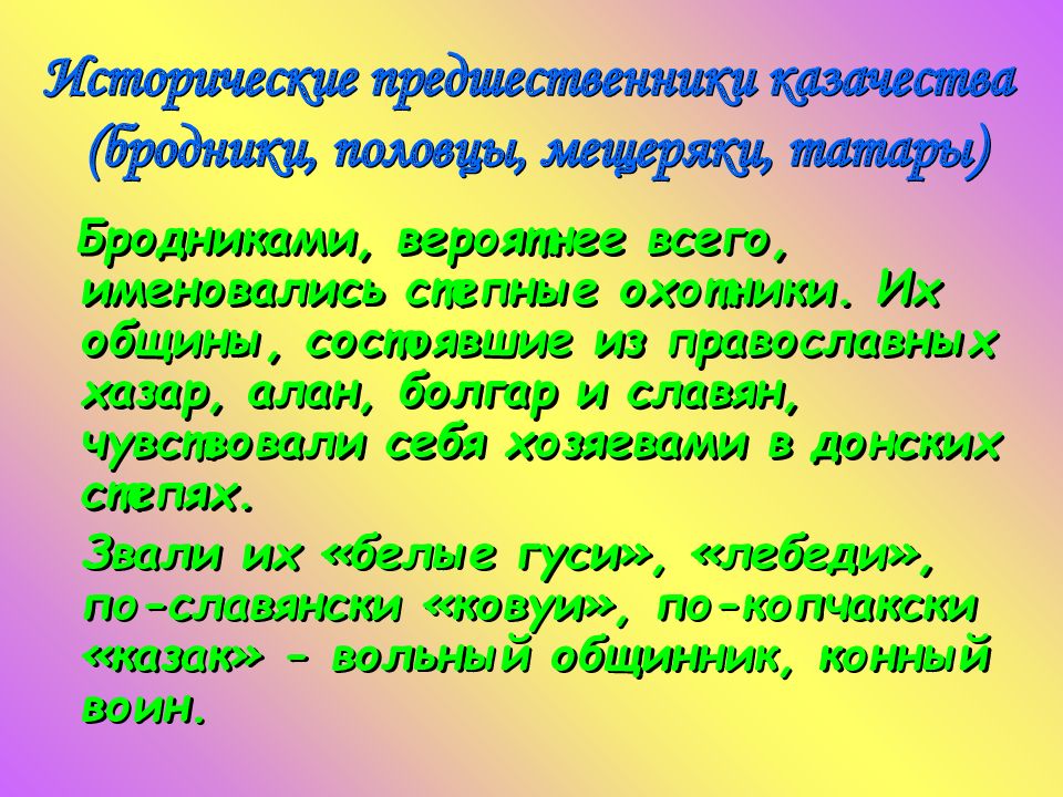Слайд 2: Исторические предшественники казачества (бродники, половцы, мещеряки, татары)