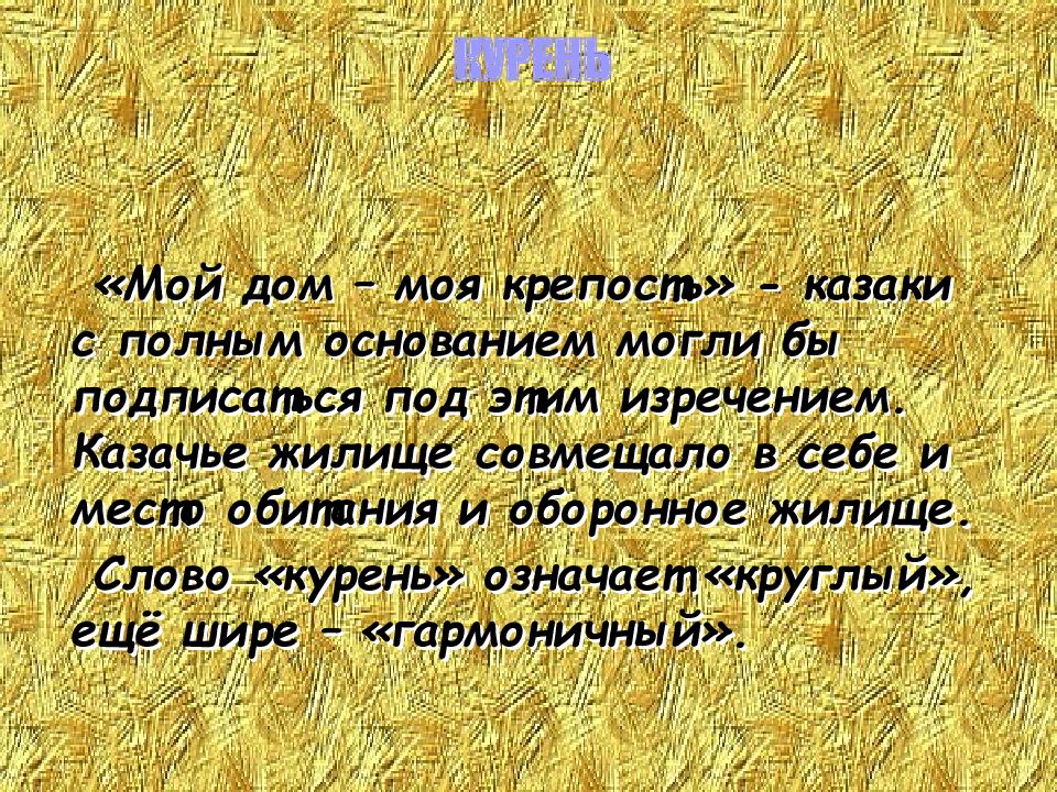 «Мой дом – моя крепость» - казаки с полным основанием могли бы подписаться под этим изречением. Казачье жилище совмещало в себе и место обитания и оборонное жилище. Слово «курень» означает «круглый», ещё шире – «гармоничный». КУРЕНЬ