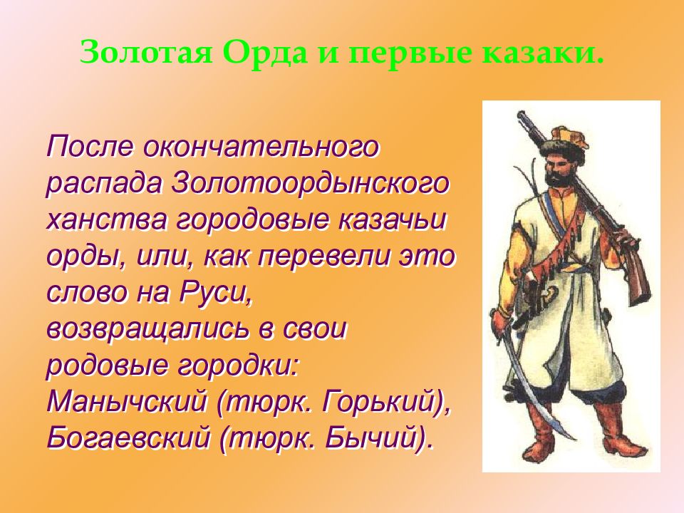После окончательного распада Золотоордынского ханства городовые казачьи орды, или, как перевели это слово на Руси, возвращались в свои родовые городки: Манычский (тюрк. Горький), Богаевский (тюрк. Бычий). Золотая Орда и первые казаки.