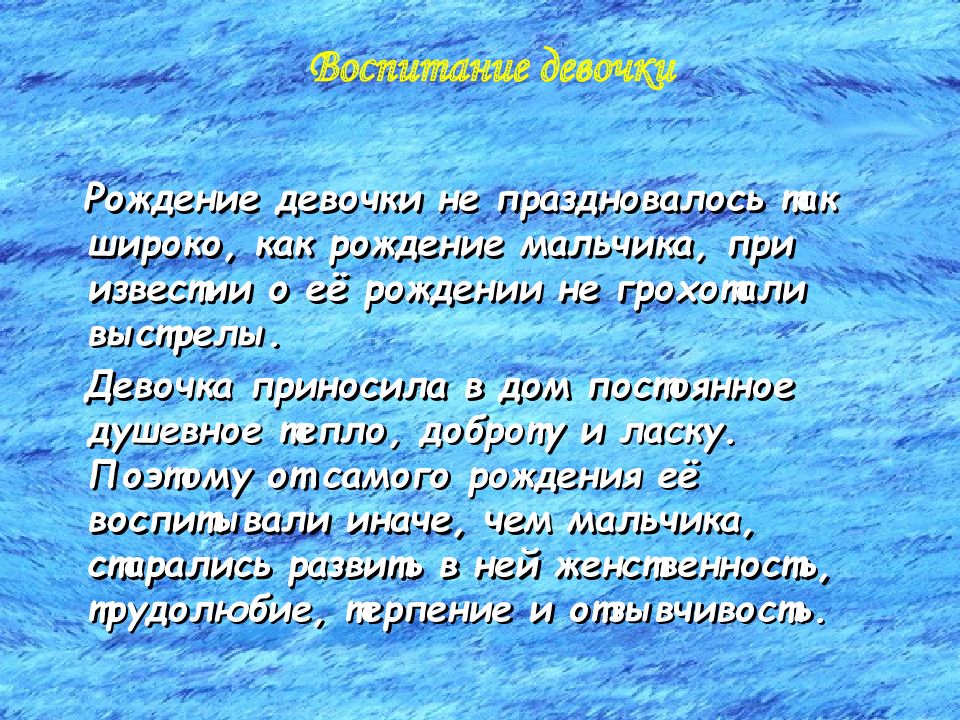 Рождение девочки не праздновалось так широко, как рождение мальчика, при известии о её рождении не грохотали выстрелы. Девочка приносила в дом постоянное душевное тепло, доброту и ласку. Поэтому от самого рождения её воспитывали иначе, чем мальчика, старались развить в ней женственность, трудолюбие, терпение и отзывчивость. Воспитание девочки
