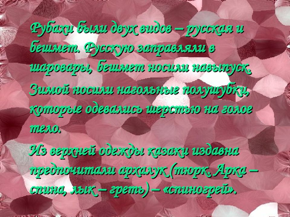 Рубахи были двух видов – русская и бешмет. Русскую заправляли в шаровары, бешмет носили навыпуск. Зимой носили нагольные полушубки, которые одевались шерстью на голое тело. Из верхней одежды казаки издавна предпочитали архалук (тюрк. Арка – спина, лык – греть) – «спиногрей».