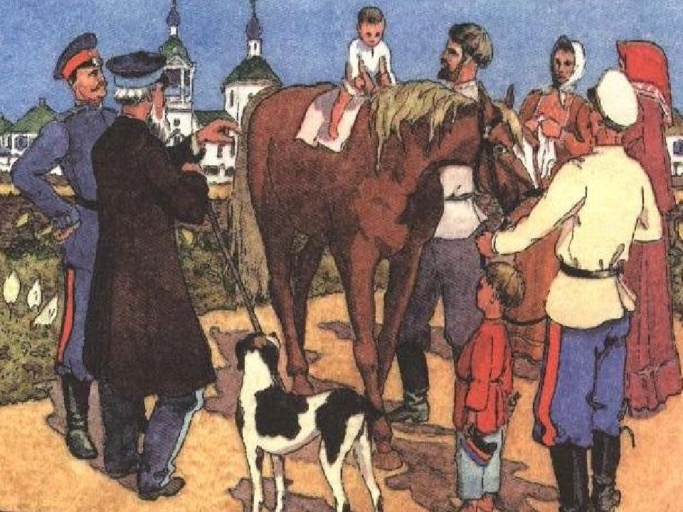 Крёстный сажает казака в первый раз на коня. Отец держит коня. Старший в роду читает молитву.