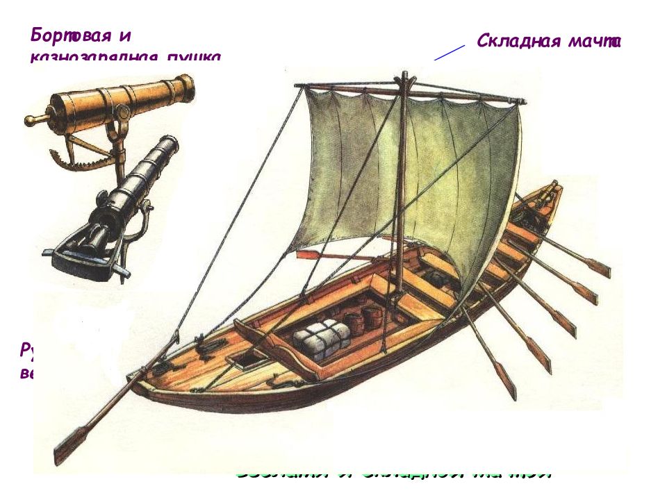 Складная мачта Рулевое весло Казачий струг с двумя рулевыми вёслами и складной мачтой Бортовая и казнозарядная пушка