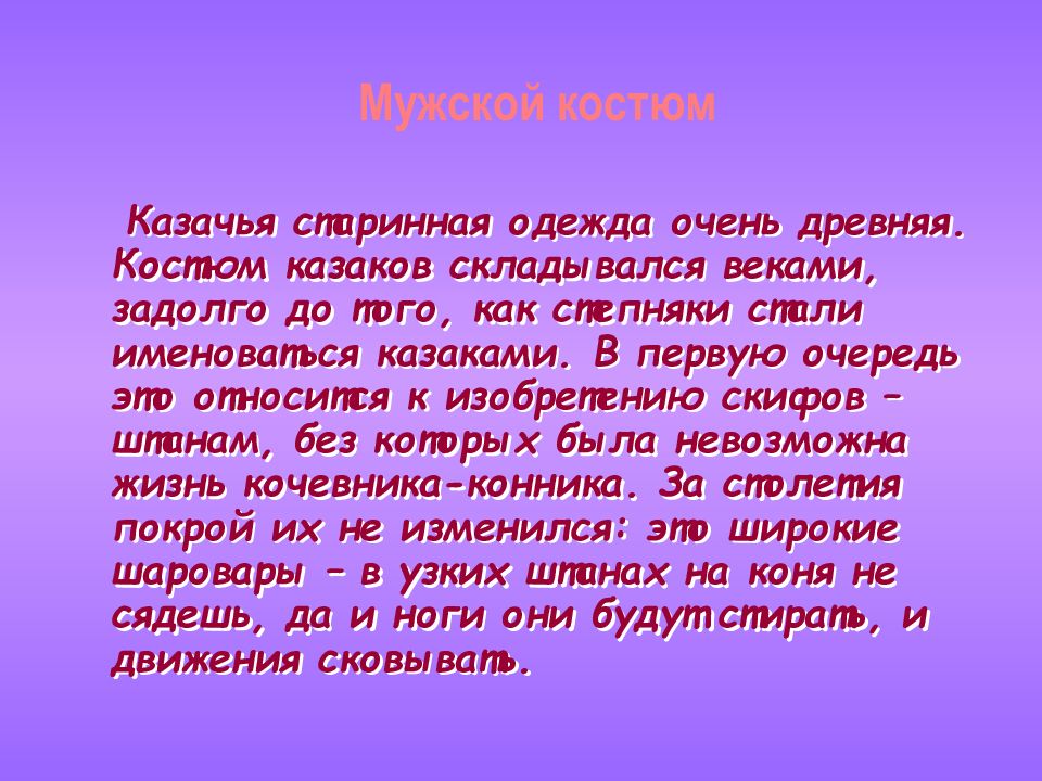Казачья старинная одежда очень древняя. Костюм казаков складывался веками, задолго до того, как степняки стали именоваться казаками. В первую очередь это относится к изобретению скифов – штанам, без которых была невозможна жизнь кочевника-конника. За столетия покрой их не изменился: это широкие шаровары – в узких штанах на коня не сядешь, да и ноги они будут стирать, и движения сковывать. Мужской костюм