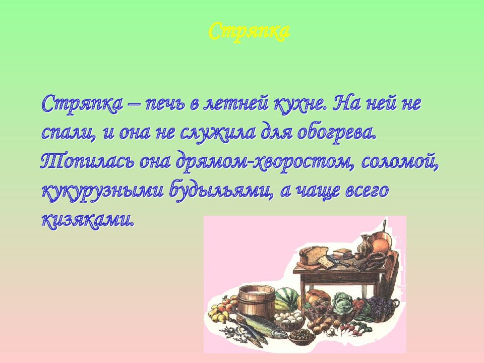 Стряпка – печь в летней кухне. На ней не спали, и она не служила для обогрева. Топилась она дрямом-хворостом, соломой, кукурузными будыльями, а чаще всего кизяками. Стряпка