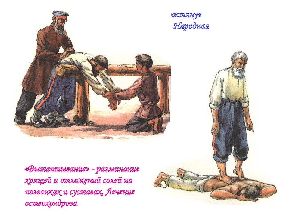 «Правят позвонки», растянув больного на коновязи. Народная мануальная терапия. «Вытаптывание» - разминание хрящей и отложений солей на позвонках и суставах. Лечение остеохондроза.