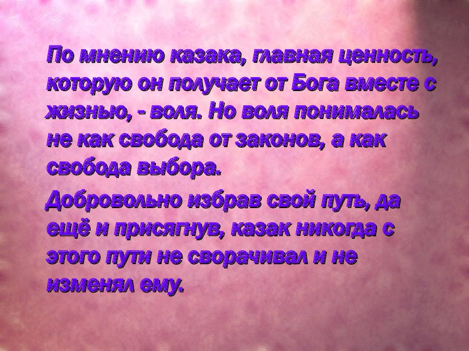 По мнению казака, главная ценность, которую он получает от Бога вместе с жизнью, - воля. Но воля понималась не как свобода от законов, а как свобода выбора. Добровольно избрав свой путь, да ещё и присягнув, казак никогда с этого пути не сворачивал и не изменял ему.