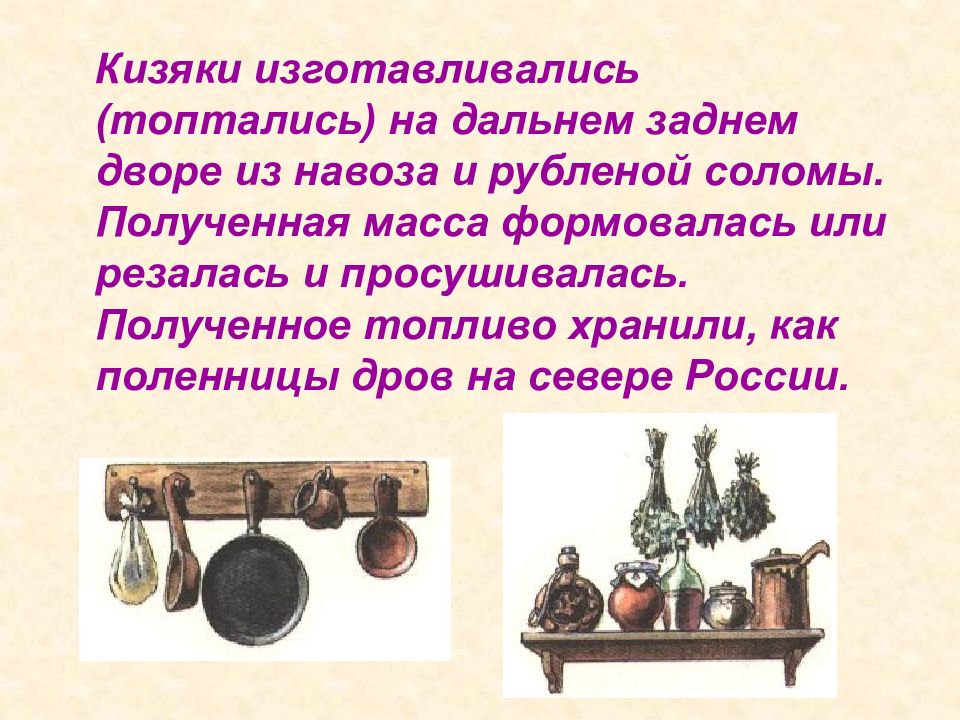 Кизяки изготавливались (топтались) на дальнем заднем дворе из навоза и рубленой соломы. Полученная масса формовалась или резалась и просушивалась. Полученное топливо хранили, как поленницы дров на севере России.