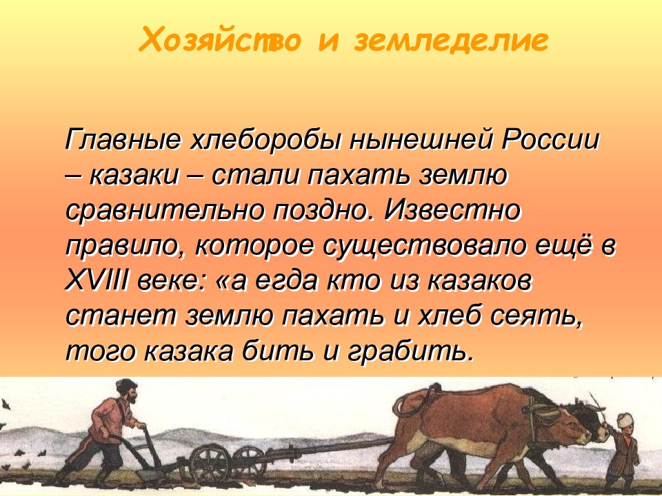 Главные хлеборобы нынешней России – казаки – стали пахать землю сравнительно поздно. Известно правило, которое существовало ещё в XVIII веке: «а егда кто из казаков станет землю пахать и хлеб сеять, того казака бить и грабить. Хозяйство и земледелие