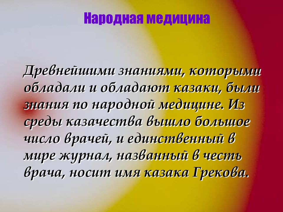 Древнейшими знаниями, которыми обладали и обладают казаки, были знания по народной медицине. Из среды казачества вышло большое число врачей, и единственный в мире журнал, названный в честь врача, носит имя казака Грекова. Народная медицина