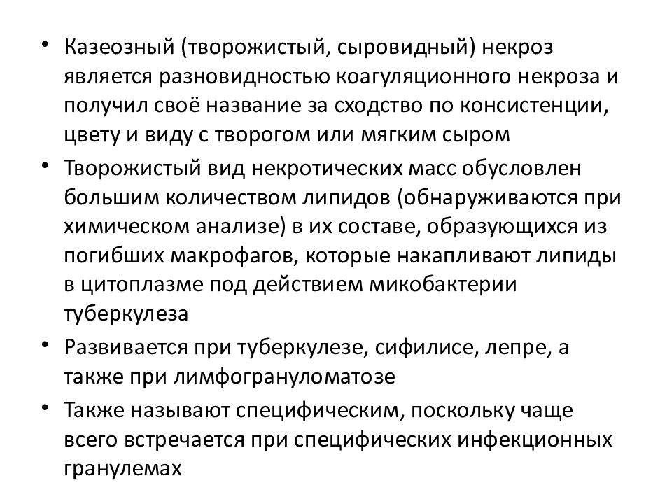 Казеозный ( творожистый, сыровидный) некроз является разновидностью коагуляционного некроза и получил своё название за сходство по консистенции, цвету и виду с творогом или мягким сыром Творожистый вид некротических масс обусловлен большим количеством липидов (обнаруживаются при химическом анализе) в их составе, образующихся из погибших макрофагов, которые накапливают липиды в цитоплазме под действием микобактерии туберкулеза Развивается при туберкулезе, сифилисе, лепре, а также при лимфогрануломатозе Также называют специфическим, поскольку чаще всего встречается при специфических инфекционных гранулемах