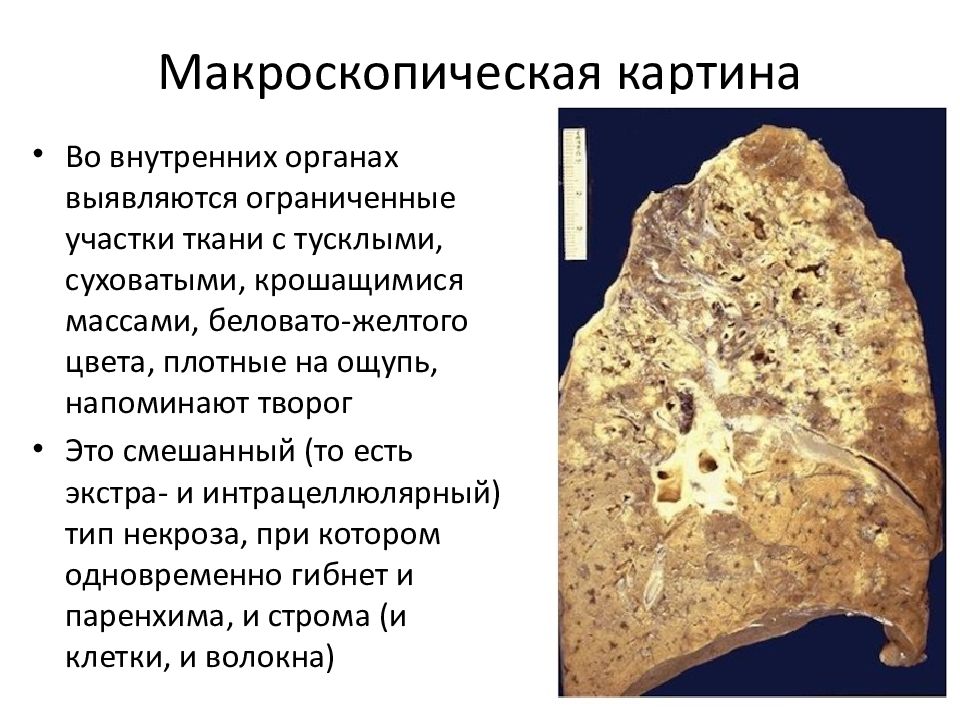 Во внутренних органах выявляются ограниченные участки ткани с тусклыми, суховатыми, крошащимися массами, беловато-желтого цвета, плотные на ощупь, напоминают творог Это смешанный (то есть экстра- и интрацеллюлярный ) тип некроза, при котором одновременно гибнет и паренхима, и строма (и клетки, и волокна )