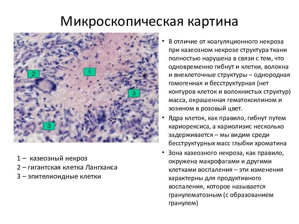 В отличие от коагуляционного некроза при казеозном некрозе структура ткани полностью нарушена в связи с тем, что одновременно гибнут и клетки, волокна и внеклеточные структуры – однородная гомогенная и бесструктурная (нет контуров клеток и волокнистых структур) масса, окрашенная гематоксилином и эозином в розовый цвет. Ядра клеток, как правило, гибнут путем кариорексиса, а кариолизис несколько задерживается – мы видим среди бесструктурных масс глыбки хроматина Зона казеозного некроза, как правило, окружена макрофагами и другими клетками воспаления – эти изменения характерны для продуктивного воспаления, которое называется гранулематозным (с образованием гранулем) 1 – казеозный некроз 2 – гигантская клетка Лангханса 3 – эпителиоидные клетки