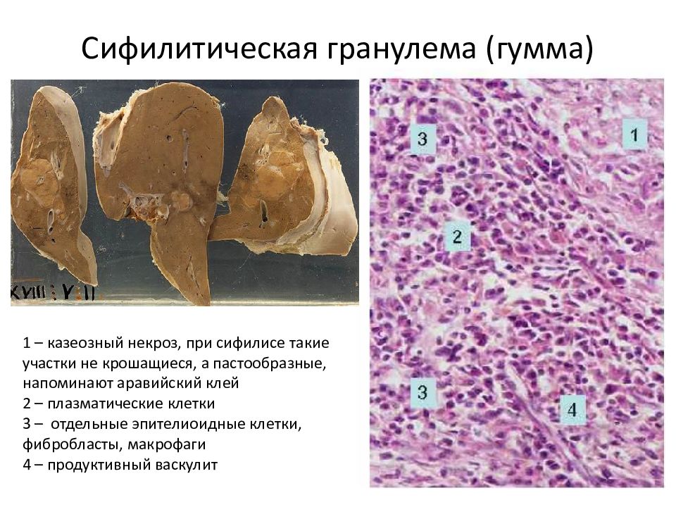 1 – казеозный некроз, при сифилисе такие участки не крошащиеся, а пастообразные, напоминают аравийский клей 2 – плазматические клетки 3 – отдельные эпителиоидные клетки, фибробласты, макрофаги 4 – продуктивный васкулит