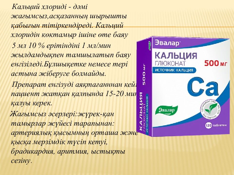 Кальций хлориді - дәмі жағымсыз, асқазанның шырышты қабығын тітіркендіреді. Кальций хлоридін көктамыр ішіне өте баяу 5 мл 10 % ерітіндіні 1 мл/мин жылдамдықпен тамшылатып баяу енгізіледі. Бұлшықетке немесе тері астына жіберуге болмайды. Препарат енгізуді аяқтағанннан кейін пациент жатқан қалпында 15-20 мин қалуы керек. Жағымсыз әсерлері:жүрек-қан тамырлар жүйесі тарапынан : артериялық қысымның орташа және қысқа мерзімдік түсіп кетуі, брадикардия, аритмия, ыстықты сезіну.