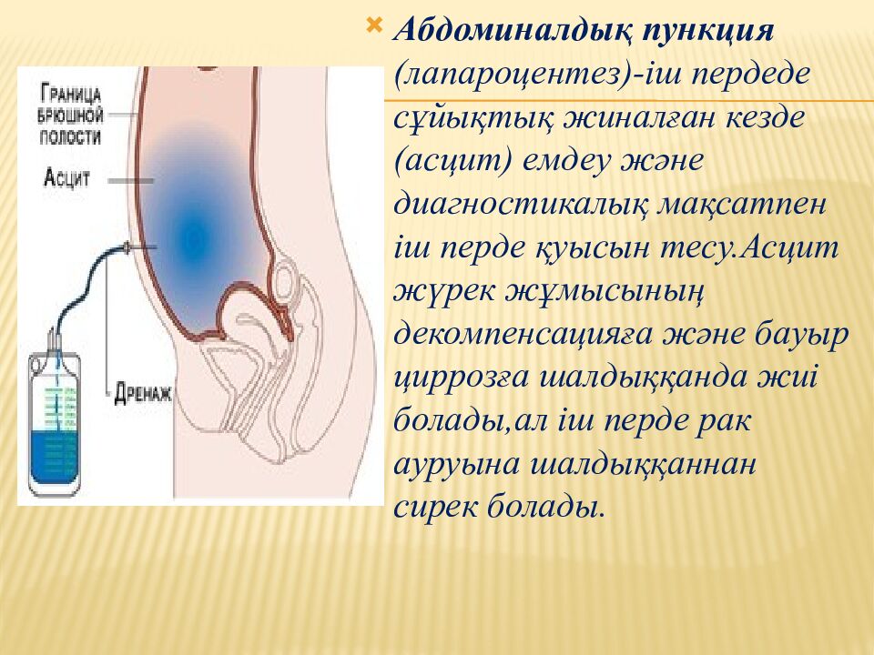 Абдоминалдық пункция (лапароцентез)-іш пердеде сұйықтық жиналған кезде (асцит) емдеу және диагностикалық мақсатпен іш перде қуысын тесу.Асцит жүрек жұмысының декомпенсацияға және бауыр циррозға шалдыққанда жиі болады,ал іш перде рак ауруына шалдыққаннан сирек болады.