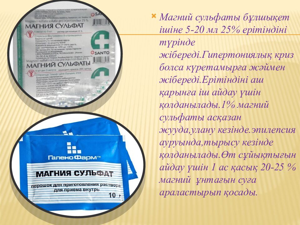 Магний сульфаты бұлшықет ішіне 5-20 мл 25 % ерітіндіні түрінде жібереді.Гипертониялық криз болса күретамырға жәймен жібереді.Ерітіндіні аш қарынға іш айдау үшін қолданылады.1 % магний сульфаты асқазан жууда,улану кезінде.эпилепсия ауруында,тырысу кезінде қолданылады.Өт сұйықтығын айдау үшін 1 ас қасық 20-25 % магний ұнтағын суға араластырып қосады.