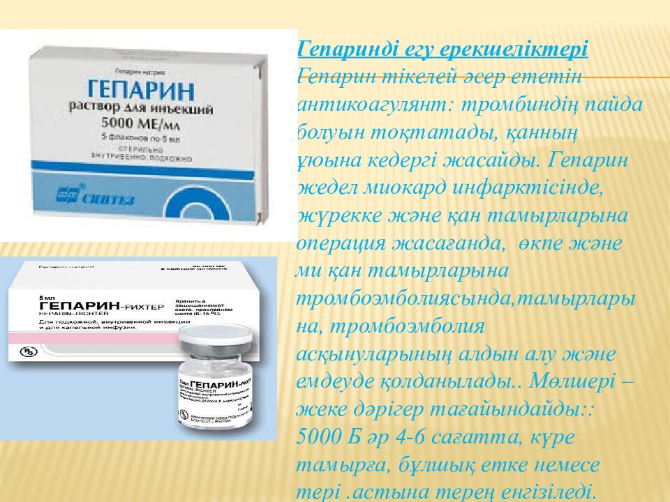 Гепаринді егу ерекшеліктері Гепарин тікелей әсер ететін антикоагулянт: тромбиндің пайда болуын тоқтатады, қанның ұюына кедергі жасайды. Гепарин жедел миокард инфарктісінде, жүрекке және қан тамырларына операция жасағанда, өкпе және ми қан тамырларына тромбоэмболиясында,тамырларына, тромбоэмболия асқынуларының алдын алу және емдеуде қолданылады.. Мөлшері – жеке дәрігер тағайындайды:: 5000 Б әр 4-6 сағатта, күре тамырға, бұлшық етке немесе тері.астына терең енгізіледі.