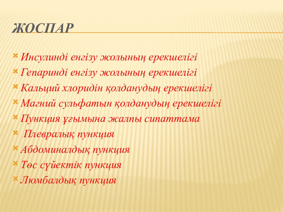Инсулинді енгізу жолының ерекшелігі Гепаринді енгізу жолының ерекшелігі Кальций хлоридін қолданудың ерекшелігі Магний сульфатын қолданудың ерекшелігі Пункция ұғымына жалпы сипаттама Плевралық пункция Абдоминалдық пункция Төс сүйектік пункция Люмбалдық пункция