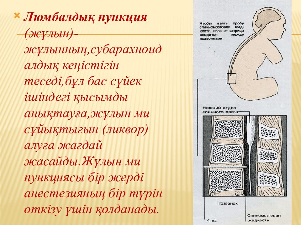 Люмбалдық пункция (жұлын)-жұлынның,субарахноидалдық кеңістігін теседі,бұл бас сүйек ішіндегі қысымды анықтауға,жұлын ми сұйықтығын (ликвор) алуға жағдай жасайды.Жұлын ми пункциясы бір жерді анестезияның бір түрін өткізу үшін қолданады.