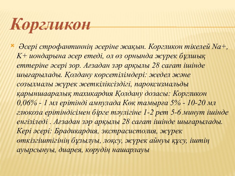 Әсері строфантиннің әсеріне жақын. Коргликон тікелей Na+, K+ иондарына әсер етеді, ол өз орнында жүрек бұлшық еттеріне әсері зор. Ағзадан зәр арқылы 28 сағат ішінде шығарылады. Қолдану көрсетілімдері: жедел және созылмалы жүрек жеткіліксіздігі, пароксизмальды қарыншааралық тахикардия Қолдану дозасы : Коргликон 0,06% - 1 мл ерітінді ампулада Көк тамырға 5% - 10-20 мл глюкоза ерітіндісімен бірге тәулігіне 1-2 рет 5-6 минут ішінде енгізіледі. Ағзадан зәр арқылы 28 сағат ішінде шығарылады. Кері әсері: Брадикардия, экстрасистолия, жүрек өткізгіштігінің бұзылуы, лоқсу, жүрек айнуы құсу, іштің ауырсынуы, диарея, көрудің нашарлауы