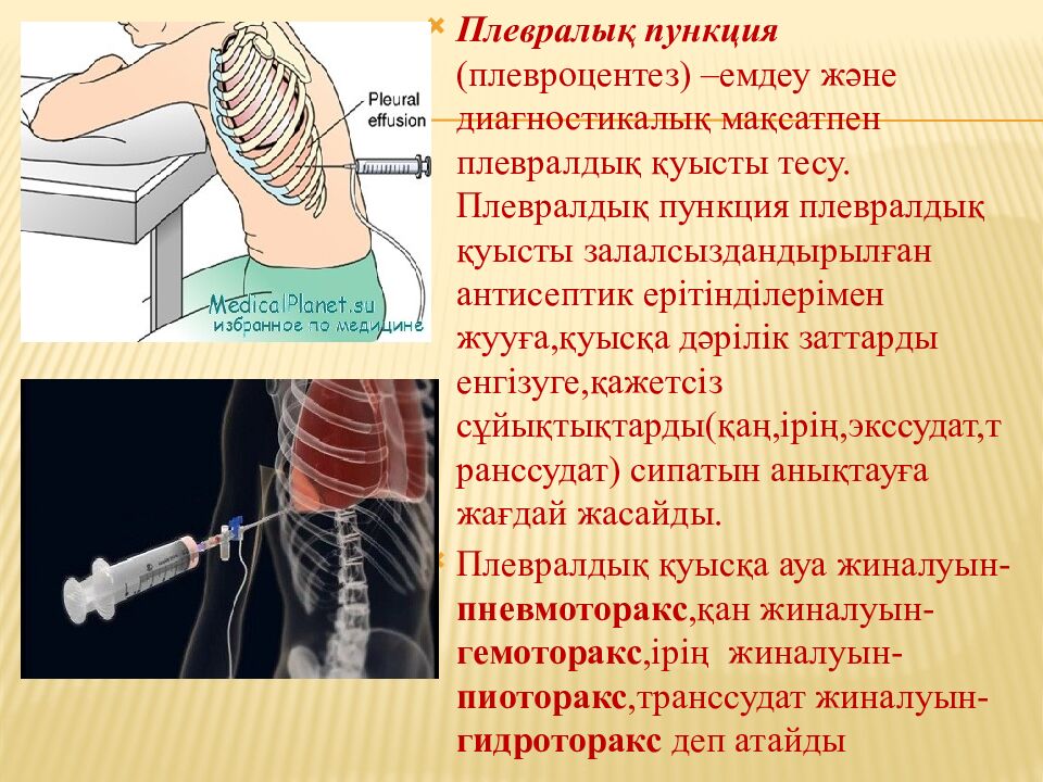 Плевралық пункция (плевроцентез) –емдеу және диагностикалық мақсатпен плевралдық қуысты тесу. Плевралдық пункция плевралдық қуысты залалсыздандырылған антисептик ерітінділерімен жууға,қуысқа дәрілік заттарды енгізуге,қажетсіз сұйықтықтарды(қаң,ірің,экссудат,транссудат) сипатын анықтауға жағдай жасайды. Плевралдық қуысқа ауа жиналуын- пневмоторакс,қан жиналуын- гемоторакс,ірің жиналуын- пиоторакс,транссудат жиналуын- гидроторакс деп атайды