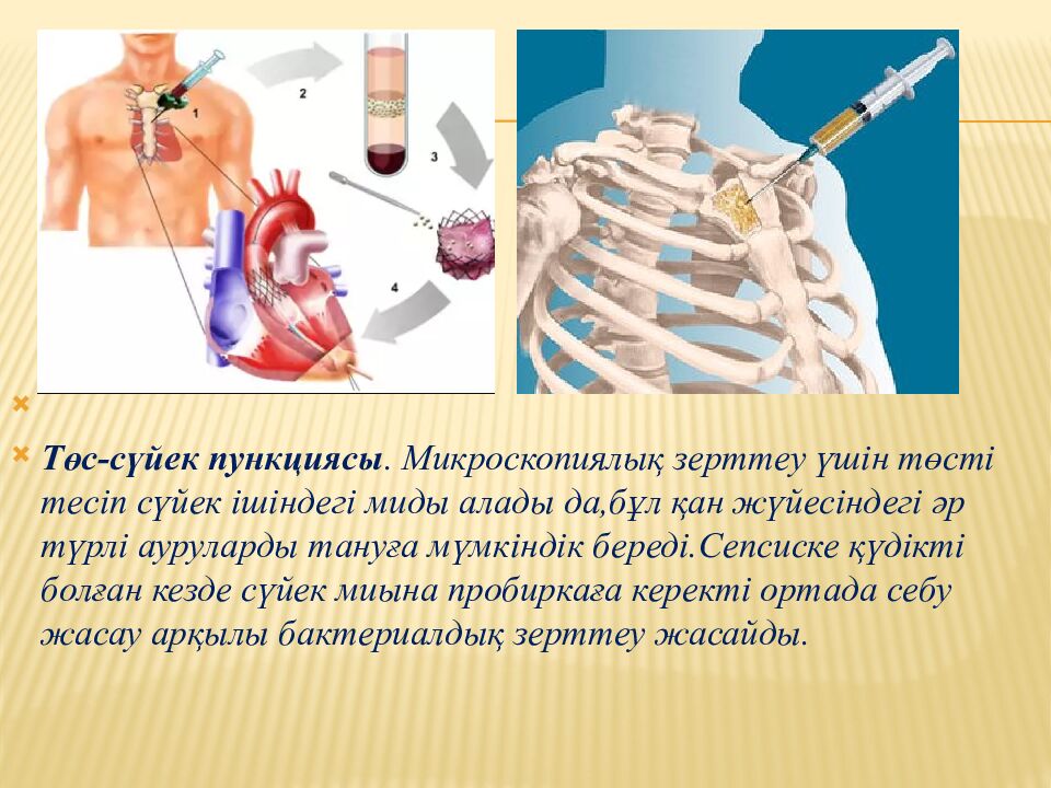 Төс-сүйек пункциясы. Микроскопиялық зерттеу үшін төсті тесіп сүйек ішіндегі миды алады да,бұл қан жүйесіндегі әр түрлі ауруларды тануға мүмкіндік береді.Сепсиске қүдікті болған кезде сүйек миына пробиркаға керекті ортада себу жасау арқылы бактериалдық зерттеу жасайды.