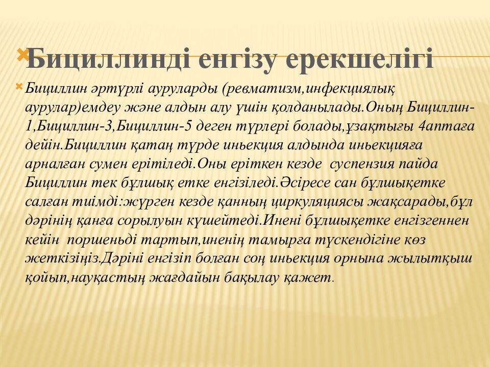 Бициллинді енгізу ерекшелігі Бициллин әртүрлі ауруларды (ревматизм,инфекциялық аурулар)емдеу және алдын алу үшін қолданылады.Оның Бициллин-1,Бициллин-3,Бициллин-5 деген түрлері болады,ұзақтығы 4аптаға дейін.Бициллин қатаң түрде иньекция алдында иньекцияға арналған сумен ерітіледі.Оны еріткен кезде суспензия пайда Бициллин тек бұлшық етке енгізіледі.Әсіресе сан бұлшықетке салған тиімді:жүрген кезде қанның циркуляциясы жақсарады,бұл дәрінің қанға сорылуын күшейтеді.Инені бұлшықетке енгізгеннен кейін поршеньді тартып,иненің тамырға түскендігіне көз жеткізіңіз.Дәріні енгізіп болған соң иньекция орнына жылытқыш қойып,науқастың жағдайын бақылау қажет.