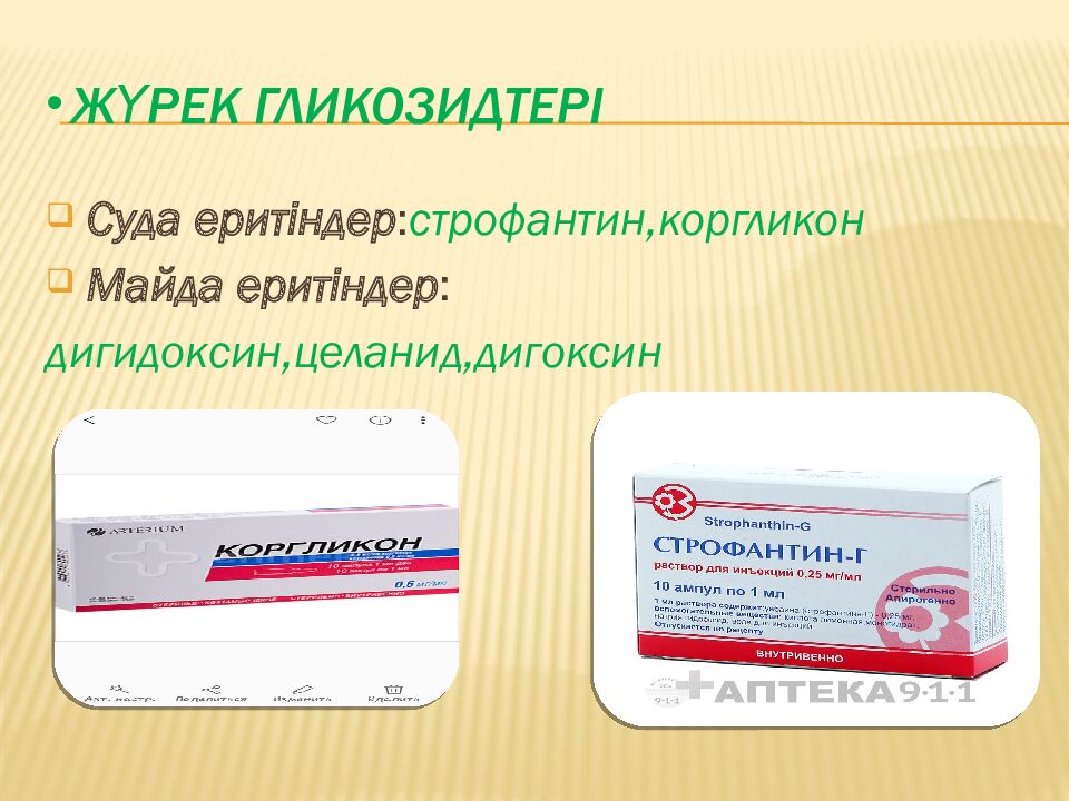 Суда еритіндер : строфантин,коргликон Майда еритіндер : дигидоксин,целанид,дигоксин