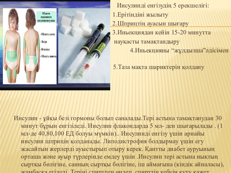 Инсулинді енгізудің 5 ерекшелігі : 1.Ерітіндіні жылыту 2.Шприцтің ауасын шығару 3.Иньекциядан кейін 15-20 минутта науқасты тамақтандыру 4.Иньекцияны “жұлдызша”әдісімен енгізу 5.Таза мақта шариктерін қолдану Инсулин - ұйқы безі гормоны болып саналады.Тері астына тамақтанудан 30 минут бұрын енгізіледі. Инсулин флакондарда 5 мл- ден шығарылады. (1 мл-де 40,80,100 ЕД болуы мүмкін ).. Инсулинді енгізу үшін арнайы инсулин шприцін қолданады. Липодистрофия болдырмау үшін егу жасайтын жерлерді ауыстырып отыру керек. Қантты диабет ауруының орташа және ауыр түрлерінде емдеу үшін.Инсулин тері астына иықтың сыртқы бөлігіне, санның сыртқы бөлігіне, іш аймағына ( кіндік айналасы ), жамбасқа егіледі. Теріні спиртпен өңдеп, спирттің кебуін күту қажет