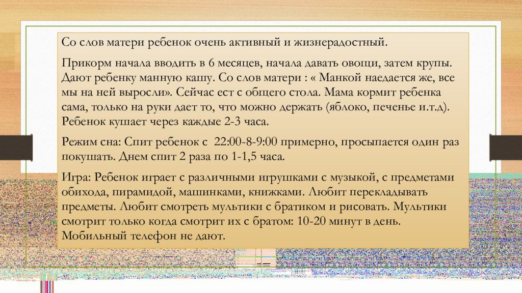 Со слов матери ребенок очень активный и жизнерадостный. Прикорм начала вводить в 6 месяцев, начала давать овощи, затем крупы. Дают ребенку манную кашу. Со слов матери : « Манкой наедается же, все мы на ней выросли». Сейчас ест с общего стола. Мама кормит ребенка сама, только на руки дает то, что можно держать (яблоко, печенье и.т.д ). Ребенок кушает через каждые 2-3 часа. Режим сна: Спит ребенок с 22:00-8-9:00 примерно, просыпается один раз покушать. Днем спит 2 раза по 1-1,5 часа. Игра: Ребенок играет с различными игрушками с музыкой, с предметами обихода, пирамидой, машинками, книжками. Любит перекладывать предметы. Любит смотреть мультики с братиком и рисовать. Мультики смотрит только когда смотрит их с братом: 10-20 минут в день. Мобильный телефон не дают.