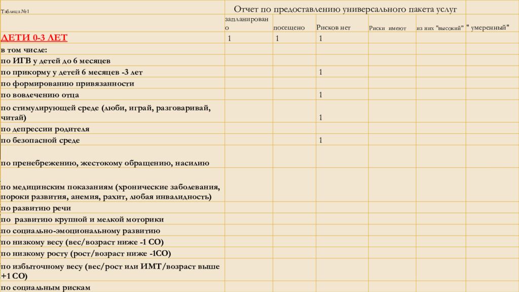 Таблица №1 Отчет по предоставлению универсального пакета услуг запланировано посещено Рисков нет Риски имеют из них "высокий" " умеренный" ДЕТИ 0-3 ЛЕТ 1 1 1 в том числе: по ИГВ у детей до 6 месяцев по прикорму у детей 6 месяцев -3 лет 1 по формированию привязанности по вовлечению отца 1 по стимулирующей среде (люби, играй, разговаривай, читай) 1 по депрессии родителя по безопасной среде 1 по пренебрежению, жестокому обращению, насилию по медицинским показаниям (хронические заболевания, пороки развития, анемия, рахит, любая инвалидность) по развитию речи по развитию крупной и мелкой моторики по социально-эмоциональному развитию по низкому весу (вес/возраст ниже -1 СО) по низкому росту (рост/возраст ниже -1СО) по избыточному весу (вес/рост или ИМТ/возраст выше +1 СО) по социальным рискам