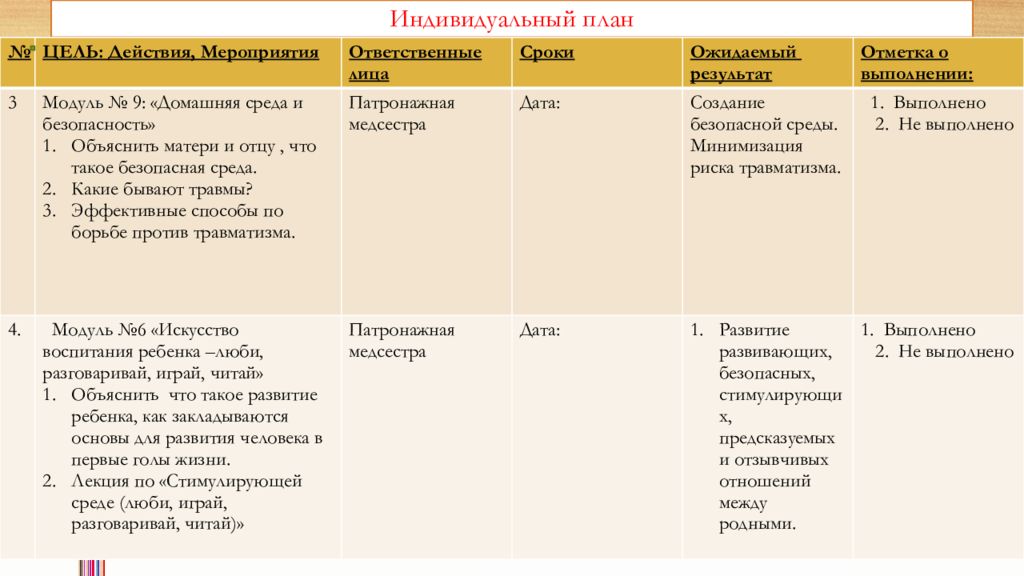 № ЦЕЛЬ: Действия, Мероприятия Ответственные лица Сроки Ожидаемый результат Отметка о выполнении: 3 Модуль № 9: «Домашняя среда и безопасность» Объяснить матери и отцу, что такое безопасная среда. Какие бывают травмы? Эффективные способы по борьбе против травматизма. Патронажная медсестра Дата: Создание безопасной среды. Минимизация риска травматизма. 1. Выполнено 2. Не выполнено 4. Модуль №6 «Искусство воспитания ребенка –люби, разговаривай, играй, читай» Объяснить что такое развитие ребенка, как закладываются основы для развития человека в первые голы жизни. Лекция по «Стимулирующей среде (люби, играй, разговаривай, читай)» Патронажная медсестра Дата: Развитие развивающих, безопасных, стимулирующих, предсказуемых и отзывчивых отношений между родными. 1. Выполнено 2. Не выполнено