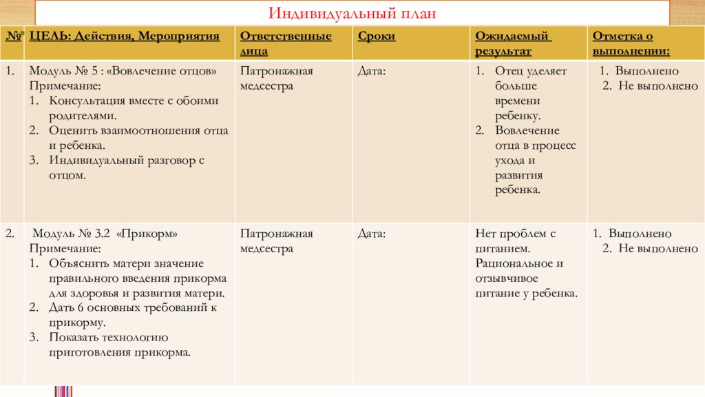 № ЦЕЛЬ: Действия, Мероприятия Ответственные лица Сроки Ожидаемый результат Отметка о выполнении: 1. Модуль № 5 : «Вовлечение отцов» Примечание: Консультация вместе с обоими родителями. Оценить взаимоотношения отца и ребенка. Индивидуальный разговор с отцом. Патронажная медсестра Дата: Отец уделяет больше времени ребенку. Вовлечение отца в процесс ухода и развития ребенка. 1. Выполнено 2. Не выполнено 2. Модуль № 3.2 «Прикорм» Примечание: Объяснить матери значение правильного введения прикорма для здоровья и развития матери. Дать 6 основных требований к прикорму. Показать технологию приготовления прикорма. Патронажная медсестра Дата: Нет проблем с питанием. Рациональное и отзывчивое питание у ребенка. 1. Выполнено 2. Не выполнено