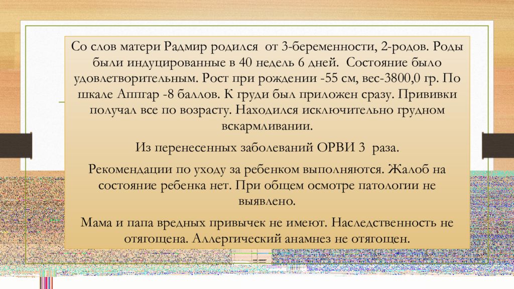 Со слов матери Радмир родился от 3-беременности, 2-родов. Роды были индуцированные в 40 недель 6 дней. Состояние было удовлетворительным. Рост при рождении -55 см, вес-3800,0 гр. По шкале Аппгар -8 баллов. К груди был приложен сразу. Прививки получал все по возрасту. Находился исключительно грудном вскармливании. Из перенесенных заболеваний ОРВИ 3 раза. Рекомендации по уходу за ребенком выполняются. Жалоб на состояние ребенка нет. При общем осмотре патологии не выявлено. Мама и папа вредных привычек не имеют. Наследственность не отягощена. Аллергический анамнез не отягощен.