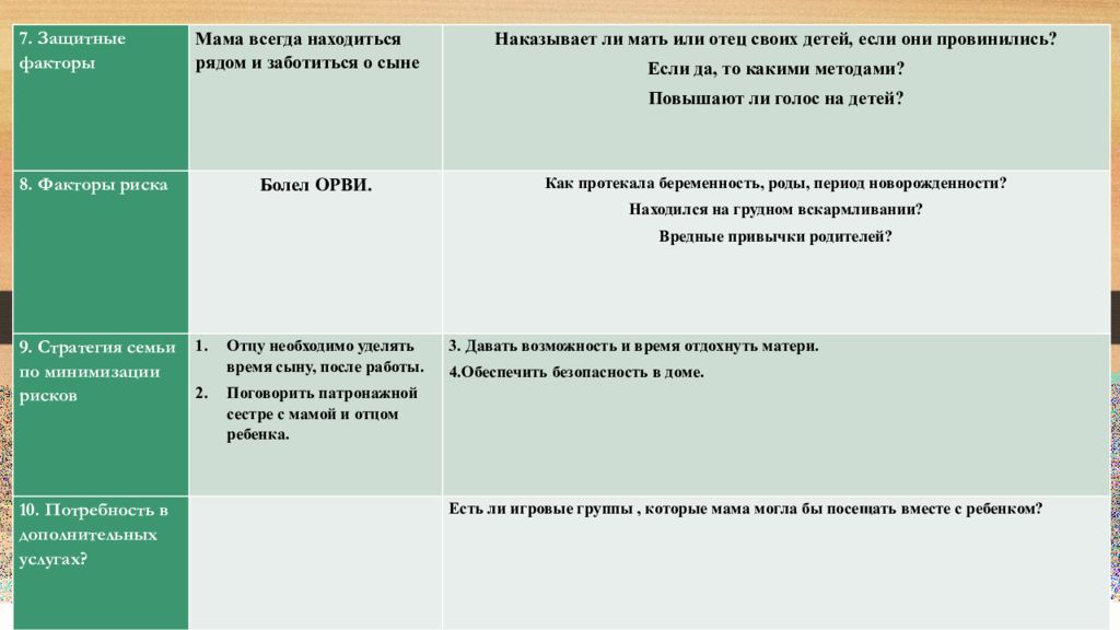 7. Защитные факторы Мама всегда находиться рядом и заботиться о сыне Наказывает ли мать или отец своих детей, если они провинились? Если да, то какими методами? Повышают ли голос на детей? 8. Факторы риска Болел ОРВИ. Как протекала беременность, роды, период новорожденности? Находился на грудном вскармливании? Вредные привычки родителей? 9. Стратегия семьи по минимизации рисков Отцу необходимо уделять время сыну, после работы. Поговорить патронажной сестре с мамой и отцом ребенка. 3. Давать возможность и время отдохнуть матери. 4.Обеспечить безопасность в доме. 10. Потребность в дополнительных услугах ? Есть ли игровые группы, которые мама могла бы посещать вместе с ребенком?
