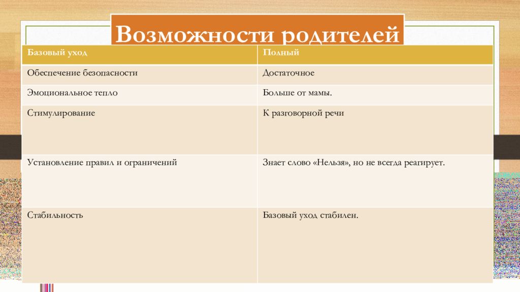 Возможности родителей Базовый уход Полный Обеспечение безопасности Достаточное Эмоциональное тепло Больше от мамы. Стимулирование К разговорной речи Установление правил и ограничений Знает слово «Нельзя», но не всегда реагирует. Стабильность Базовый уход стабилен.