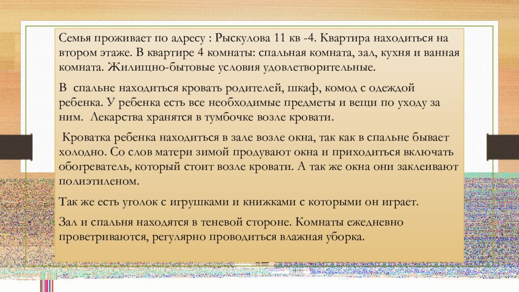 Семья проживает по адресу : Рыскулова 11 кв -4. Квартира находиться на втором этаже. В квартире 4 комнаты: спальная комната, зал, кухня и ванная комната. Жилищно-бытовые условия удовлетворительные. В спальне находиться кровать родителей, шкаф, комод с одеждой ребенка. У ребенка есть все необходимые предметы и вещи по уходу за ним. Лекарства хранятся в тумбочке возле кровати. Кроватка ребенка находиться в зале возле окна, так как в спальне бывает холодно. Со слов матери зимой продувают окна и приходиться включать обогреватель, который стоит возле кровати. А так же окна они заклеивают полиэтиленом. Так же есть уголок с игрушками и книжками с которыми он играет. Зал и спальня находятся в теневой стороне. Комнаты ежедневно проветриваются, регулярно проводиться влажная уборка.