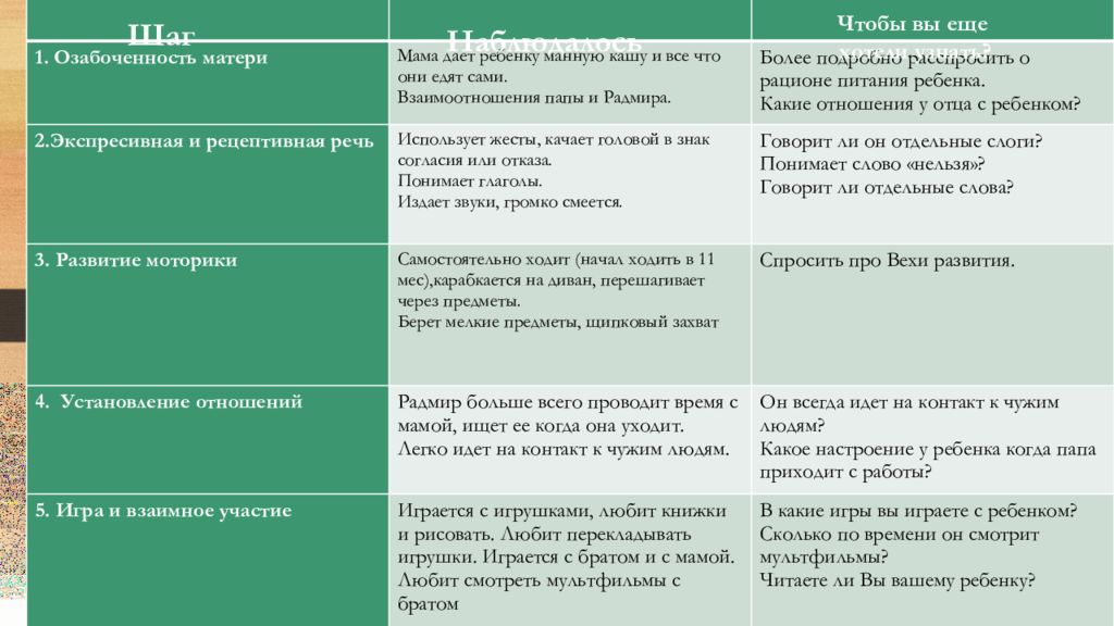 Шаг Наблюдалось Чтобы вы хотели узнать ? 1. Озабоченность матери Мама дает ребенку манную кашу и все что они едят сами. Взаимоотношения папы и Радмира. Более подробно расспросить о рационе питания ребенка. Какие отношения у отца с ребенком? 2.Экспресивная и рецептивная речь Использует жесты, качает головой в знак согласия или отказа. Понимает глаголы. Издает звуки, громко смеется. Говорит ли он отдельные слоги? Понимает слово «нельзя»? Говорит ли отдельные слова? 3. Развитие моторики Самостоятельно ходит (начал ходить в 11 мес ),карабкается на диван, перешагивает через предметы. Берет мелкие предметы, щипковый захват Спросить про Вехи развития. 4. Установление отношений Радмир больше всего проводит время с мамой, ищет ее когда она уходит. Легко идет на контакт к чужим людям. О н всегда идет на контакт к чужим людям? Какое настроение у ребенка когда папа приходит с работы? 5. Игра и взаимное участие Играется с игрушками, любит книжки и рисовать. Любит перекладывать игрушки. Играется с братом и с мамой. Любит смотреть мультфильмы с братом В какие игры вы играете с ребенком? Сколько по времени он смотрит мультфильмы? Читаете ли Вы вашему ребенку? Шаг Наблюдалось Чтобы вы еще хотели узнать?