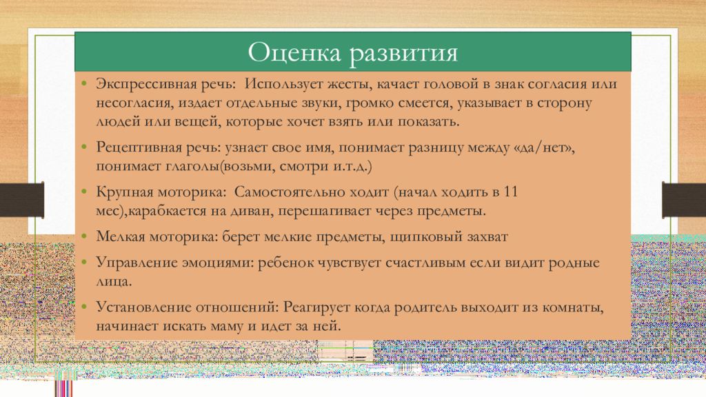 Экспрессивная речь: Использует жесты, качает головой в знак согласия или несогласия, издает отдельные звуки, громко смеется, указывает в сторону людей или вещей, которые хочет взять или показать. Рецептивная речь: узнает свое имя, понимает разницу между «да/нет», понимает глаголы(возьми, смотри и.т.д.) Крупная моторика: Самостоятельно ходит (начал ходить в 11 мес ),карабкается на диван, перешагивает через предметы. Мелкая моторика: берет мелкие предметы, щипковый захват Управление эмоциями: ребенок чувствует счастливым если видит родные лица. Установление отношений: Реагирует когда родитель выходит из комнаты, начинает искать маму и идет за ней.
