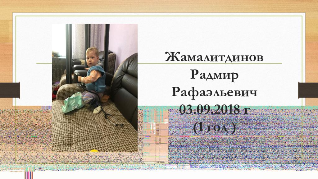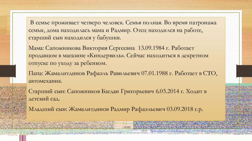 В семье проживает четверо человек. Семья полная. Во время патронажа семьи, дома находилась мама и Радмир. Отец находился на работе, старший сын находился у бабушки. Мама: Сапожникова Виктория Сергеевна 13.09.1984 г. Работает продавцом в магазине « Киндервиль ». Сейчас находиться в декретном отпуске по уходу за ребенком. Папа: Жамалитдинов Рафаэль Равильевич 07.01.1988 г. Работает в СТО, автомеханик. Старший сын: Сапожников Багдан Григорьевич 6.05.2014 г. Ходит в детский сад. Младший сын: Жамалитдинов Радмир Рафаэльевич 03.09.2018 г.р.