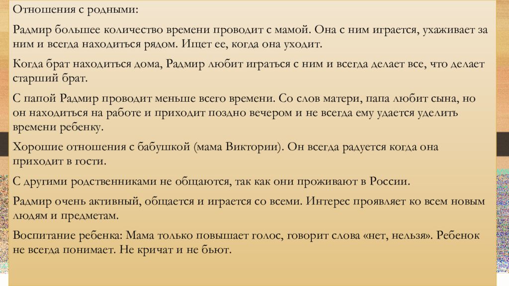 Отношения с родными: Радмир большее количество времени проводит с мамой. Она с ним играется, ухаживает за ним и всегда находиться рядом. Ищет ее, когда она уходит. Когда брат находиться дома, Радмир любит играться с ним и всегда делает все, что делает старший брат. С папой Радмир проводит меньше всего времени. Со слов матери, папа любит сына, но он находиться на работе и приходит поздно вечером и не всегда ему удается уделить времени ребенку. Хорошие отношения с бабушкой (мама Виктории). Он всегда радуется когда она приходит в гости. С другими родственниками не общаются, так как они проживают в России. Радмир очень активный, общается и играется со всеми. Интерес проявляет ко всем новым людям и предметам. Воспитание ребенка: Мама только повышает голос, говорит слова «нет, нельзя». Ребенок не всегда понимает. Не кричат и не бьют.