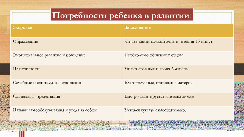 Здоровье Закаливание Образование Читать книги каждый день в течении 15 минут. Эмоциональное развитие и поведение Необходимо общение с отцом Идентичность Узнает свое имя и своих близких. Семейные и социальные отношения Благополучные, привязан к матери. Социальная презентация Быстро адаптируется к новым людям. Навыки самообслуживания и ухода за собой Учиться кушать самостоятельно. Потребности ребенка в развитии :