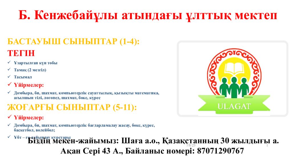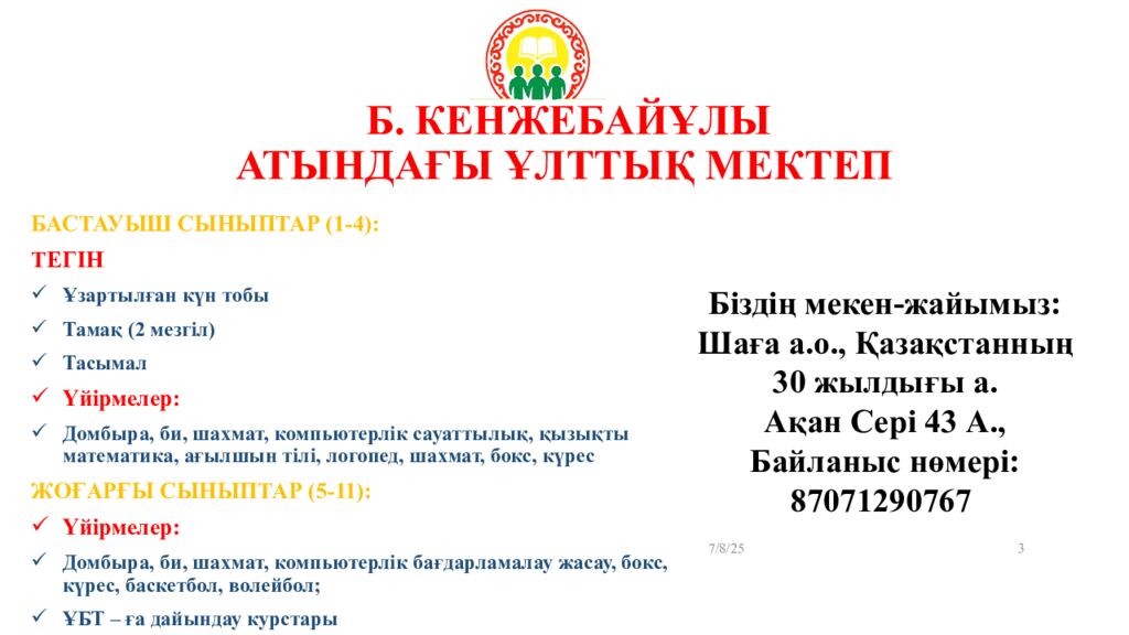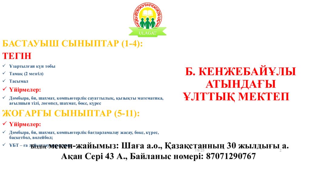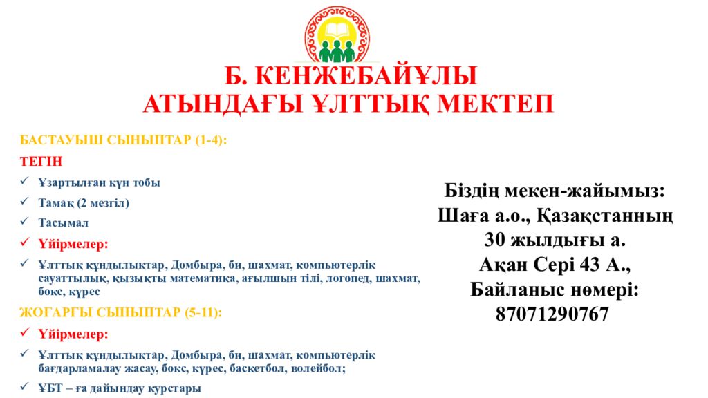 Б. КЕНЖЕБАЙҰЛЫ АТЫНДАҒЫ ҰЛТТЫҚ МЕКТЕП БАСТАУЫШ СЫНЫПТАР (1-4): ТЕГІН Ұзартылған күн тобы Тамақ (2 мезгіл ) Тасымал Үйірмелер : Ұлттық құндылықтар, Домбыра, би, шахмат, компьютерлік сауаттылық, қызықты математика, ағылшын тілі, логопед, шахмат, бокс, күрес ЖОҒАРҒЫ СЫНЫПТАР (5-11): Үйірмелер : Ұлттық құндылықтар, Домбыра, би, шахмат, компьютерлік бағдарламалау жасау, бокс, күрес, баскетбол, волейбол; ҰБТ – ға дайындау курстары Біздің мекен-жайымыз : Шаға а.о., Қазақстанның 30 жылдығы а. Ақан Сері 43 А., Байланыс нөмері : 87071290767